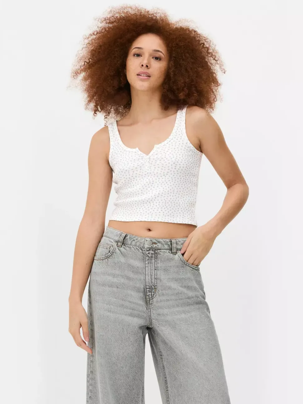 Topy i T-shirtyDekolt: Dekolt w serekKrój: Standardowy krójDługość rękawów: Bez rękawówRozmiar modelki: SMateriał: 100% bawełnaBezpieczeństwo pożarowe: OSTRZEŻENIE! Trzymać z dala od ognia