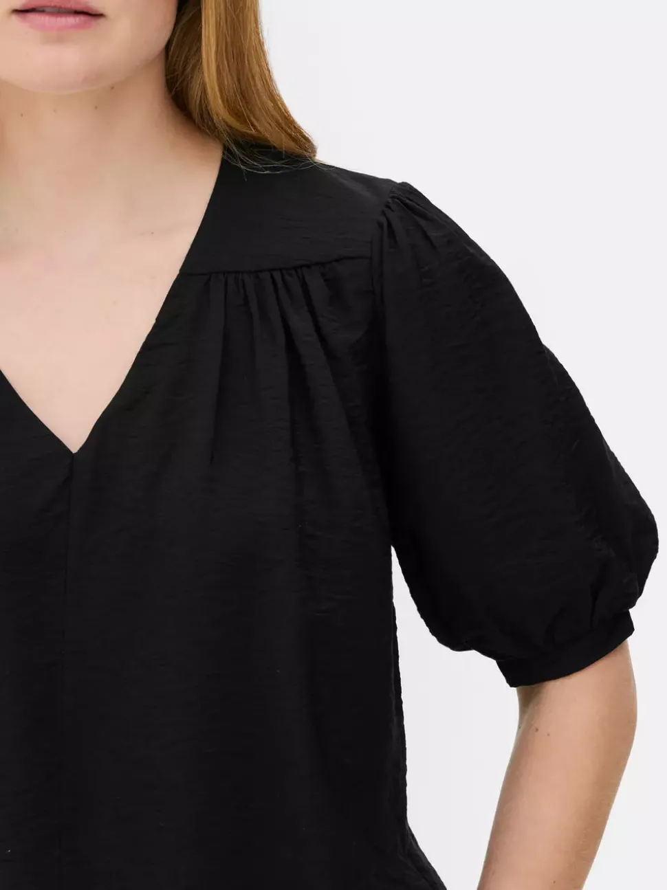 Koszule i bluzkiDekolt: Dekolt w serekKrój: Standardowy krójDługość rękawów: Krótki rękawRozmiar modelki: SMateriał: CZARNY / ZIELONY – 89% wiskoza, 11% poliamid, GRANATOWY – 85% wiskoza, 15% poliamid